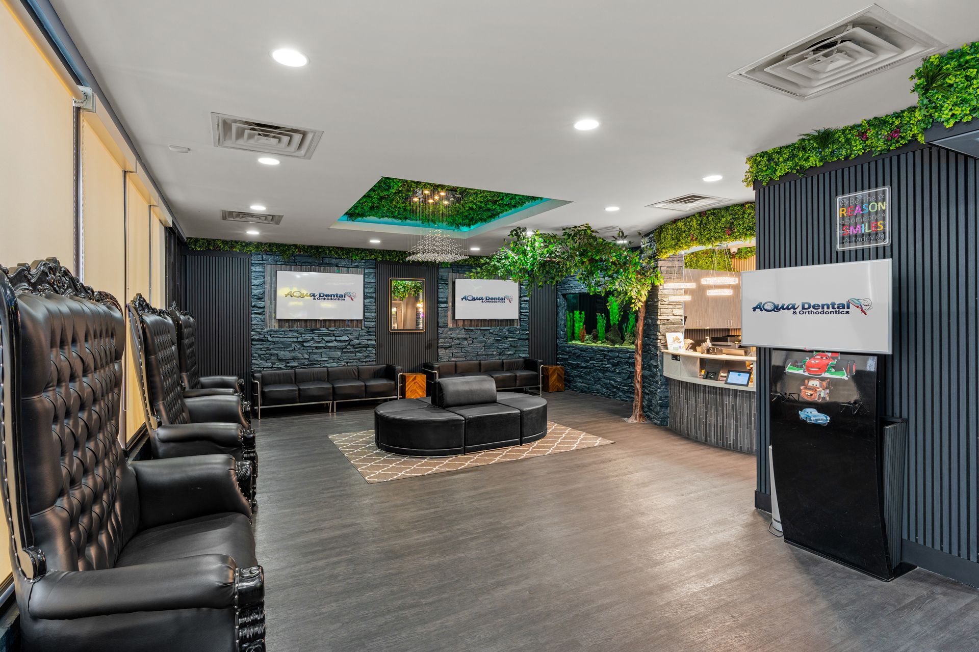 Welcome to Aqua Dental, where dental care meets relaxation and enjoyment. Step inside our water-themed office and embark on a virtual tour to discover the unique features that set us apart. Our comfort-focused lobby is designed to cater to both kids and adults, boasting full arcades, HD TVs playing popular kids movies, a captivating fresh water aquarium, and free WiFi. Immerse yourself in a soothing and inviting atmosphere as you explore our state-of-the-art facility equipped with modern and advanced technology.